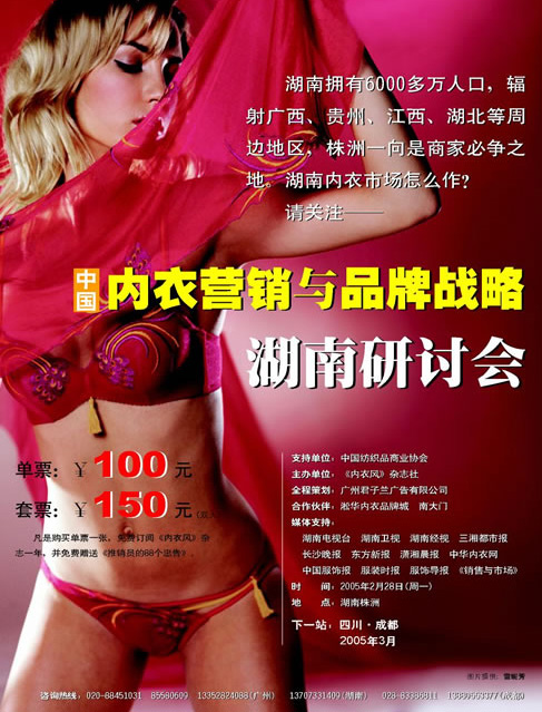 为加强内衣企业代理商与终端经营这之间的沟通,更好的开发湖南内衣终端市场,<内衣风>杂志社与中国纺织品商业协会与2005年2月28日在湖南株洲举办中国内衣营销与品牌战略(湖南)研讨会.